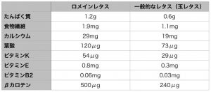 先ほどのオクラにも含まれているβカロテンがロメインレタスにも含まれています。栄養価がなんと普通のレタスに比べて2倍も違うんです!(下記参照)