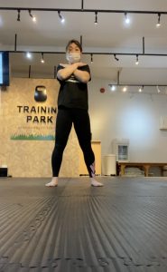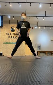 1前後に足を開きます