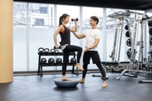 写真のようにBOSUという半円状のバランスボール&ディスクの上で