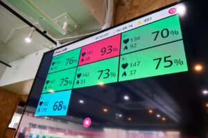 (写真のPOLARという機械で全お客様の消費カロリーや、現在の心拍数などを測っていき